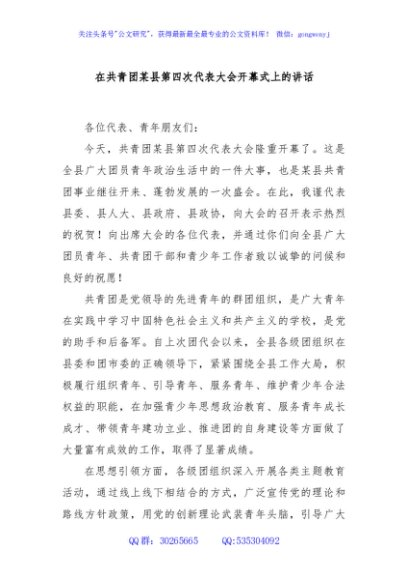 / 在共青团某县第四次代表大会开幕式上的讲话