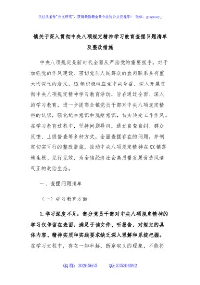 / 镇关于深入贯彻中央八项规定精神学习教育查摆问题清单及整改措施
