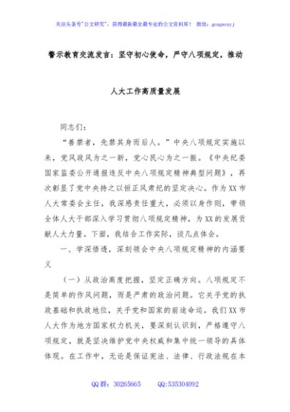 / 警示教育交流发言:坚守初心使命,严守八项规定,推动人大工作高质量发展