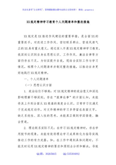 XX规定精神学习教育个人问题清单和整改措施