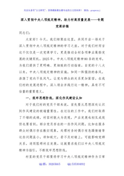 / 深入贯彻中央八项规定精神,助力村高质量发展——专题党课讲稿
