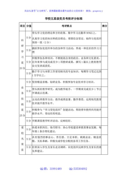 / 学校五星级党员考核评分标准(表格)
