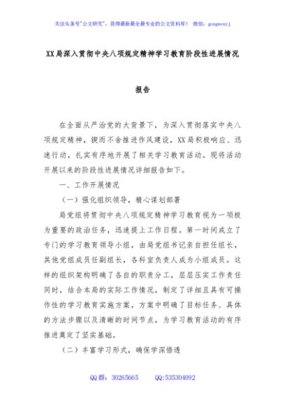 / XX局深入贯彻中央八项规定精神学习教育阶段性进展情况报告