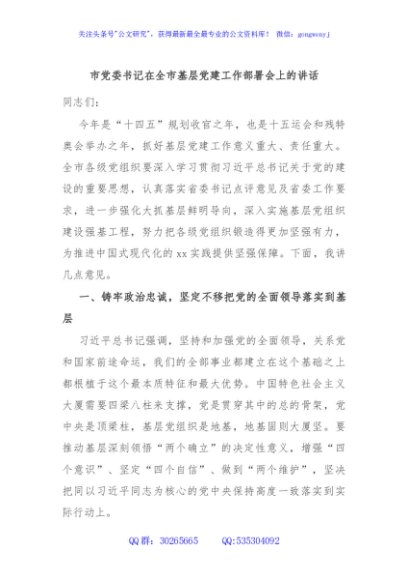 / 市党委书记在全市基层党建工作部署会上的讲话