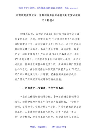 市财政局交流发言:聚焦问效多措并举打造财政重点绩效评价新模式