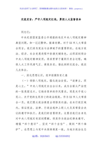 / 交流发言:严守八项规定红线,勇担人大监督使命