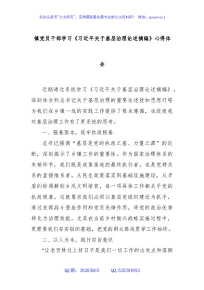 / 镇党员干部学习《习近平关于基层治理论述摘编》心得体会