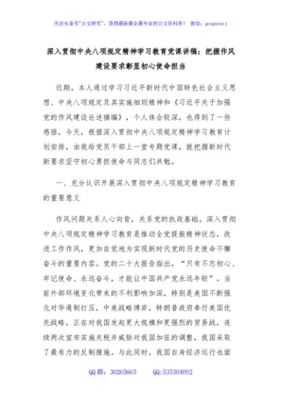 / 深入贯彻中央八项规定精神学习教育党课讲稿:把握作风建设要求彰显初心使命担当