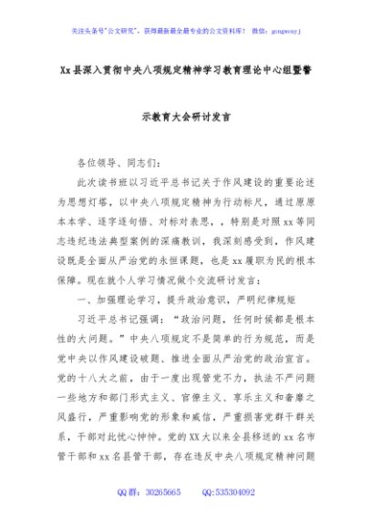 / Xx县深入贯彻中央八项规定精神学习教育理论中心组暨警示教育大会研讨发言