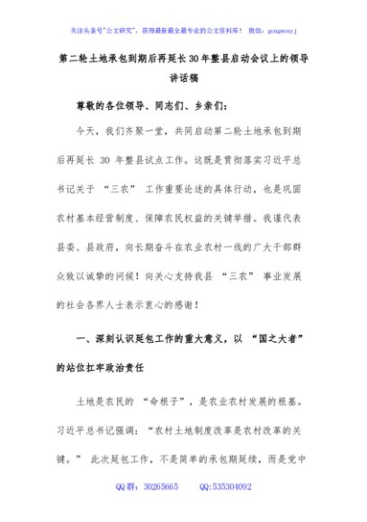 / 第二轮土地承包到期后再延长30年整县启动会议上的领导讲话稿