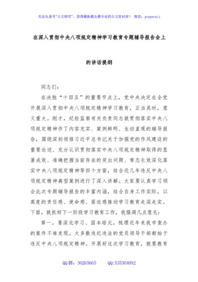 / 在深入贯彻中央八项规定精神学习教育专题辅导报告会上的讲话提纲