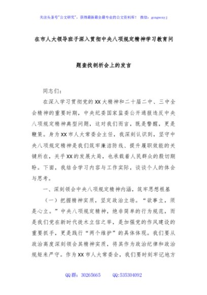 / 在市人大领导班子深入贯彻中央八项规定精神学习教育问题查找剖析会上的发言