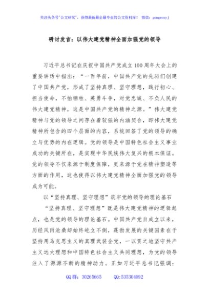 / 研讨发言:以伟大建党精神全面加强党的领导