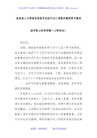 / 某某县人大常委会党组书记在中央八项规定精神学习教育读书班上的讲话稿(心得体会)