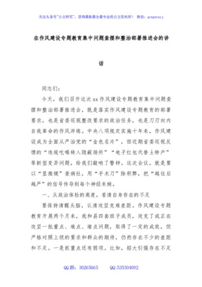 / 在作风建设专题教育集中问题查摆和整治部署推进会的讲话