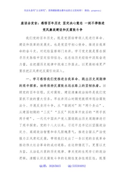 / 座谈会发言:感悟百年历史 坚定决心意志 一刻不停推进党风廉政建设和反腐败斗争