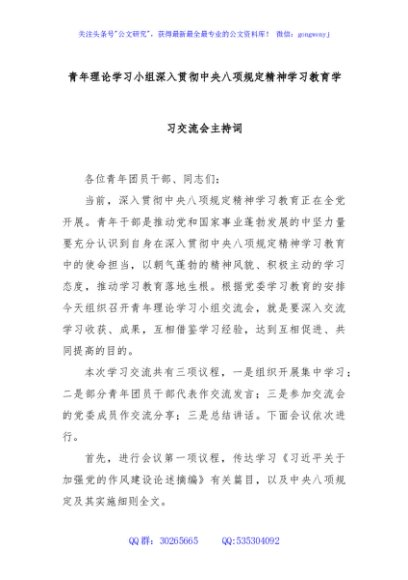 / 青年理论学习小组深入贯彻中央八项规定精神学习教育学习交流会主持词