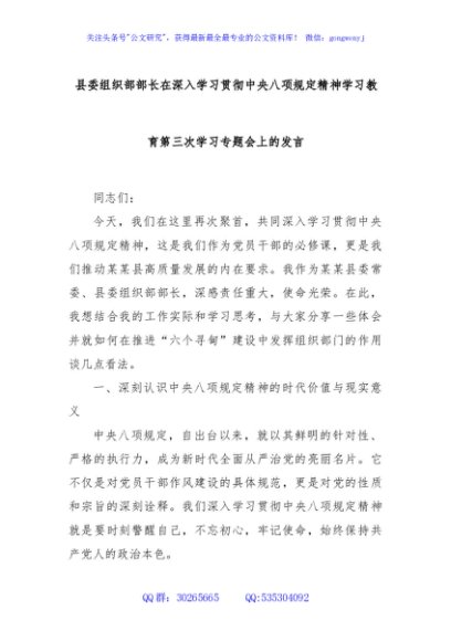 / 县委组织部部长在深入学习贯彻中央八项规定精神学习教育第三次学习专题会上的发言