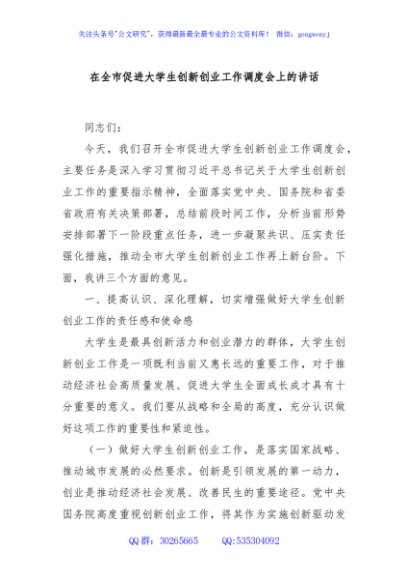 / 在全市促进大学生创新创业工作调度会上的讲话