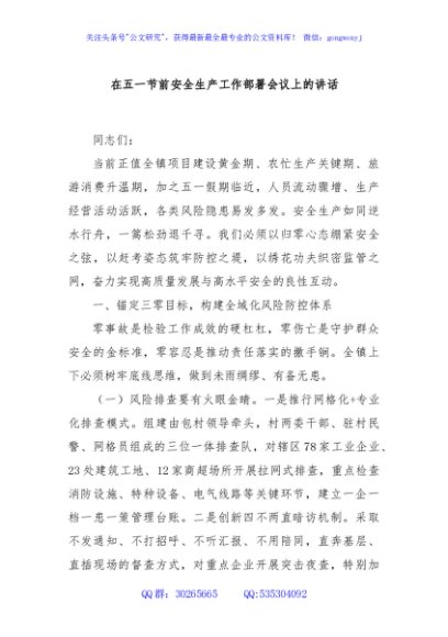 / 在五一节前安全生产工作部署会议上的讲话