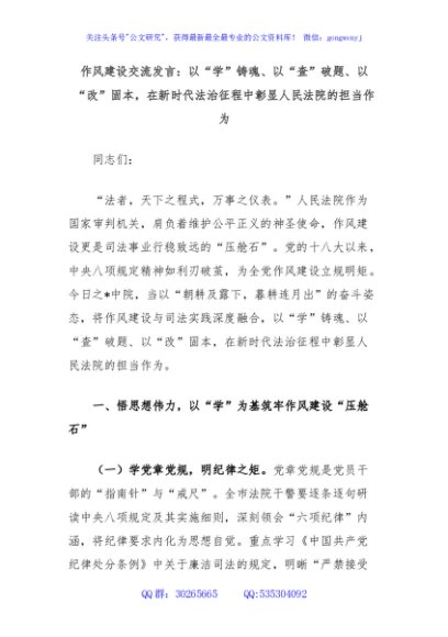 / 作风建设交流发言:以“学”铸魂、以“查”破题、以“改”固本,在新时代法治征程中彰显人民法院的担当作为