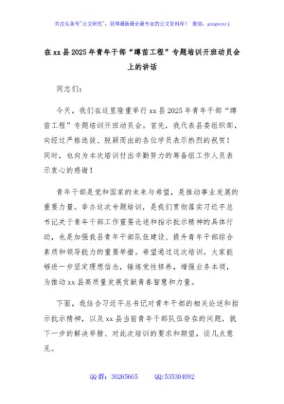 / 在xx县2025年青年干部“蹲苗工程”专题培训开班动员会上的讲话