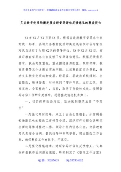 / 义务教育优质均衡发展省级督导评估反馈意见的整改报告