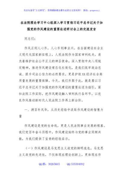 / 在法院理论学习中心组深入学习贯彻习近平总书记关于加强党的作风建设的重要论述研讨会上的交流发言