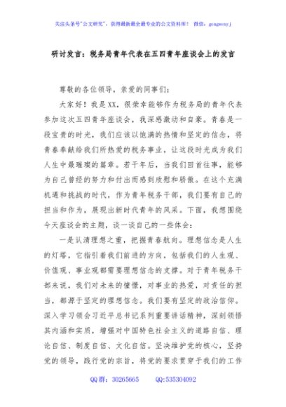 / 研讨发言:税务局青年代表在五四青年座谈会上的发言
