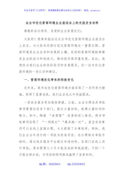 / 在全市优化营商环境企业座谈会上的交流发言材料