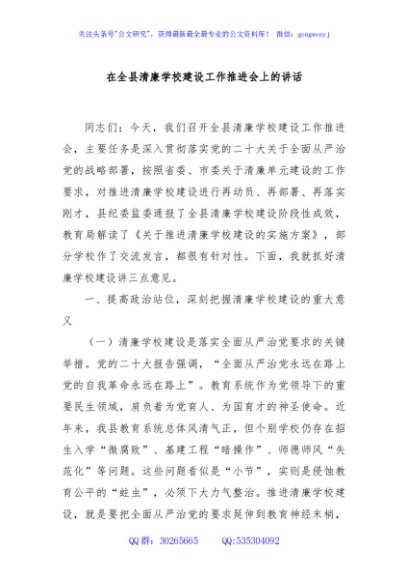 / 在全县清廉学校建设工作推进会上的讲话