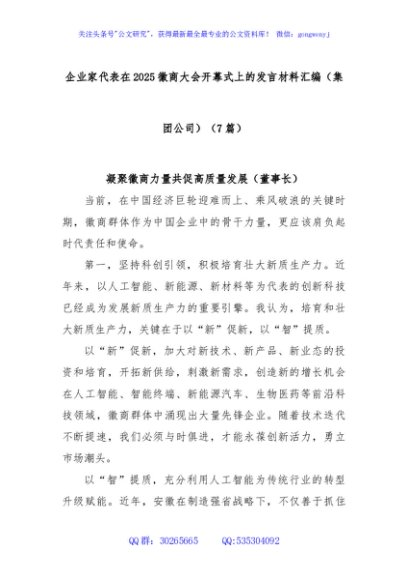 / (7篇)企业家代表在2025徽商大会开幕式上的发言材料汇编(集团公司)