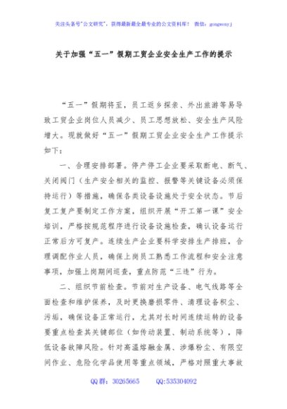/ 关于加强“五一”假期工贸企业安全生产工作的提示