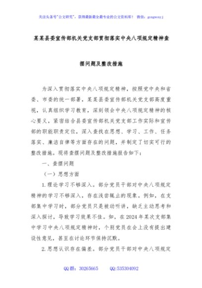 / 某某县委宣传部机关党支部贯彻落实中央八项规定精神查摆问题及整改措施