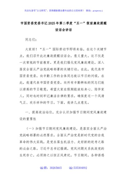 / 市国资委党委书记2025年第二季度“五一”假前廉政提醒谈话会讲话