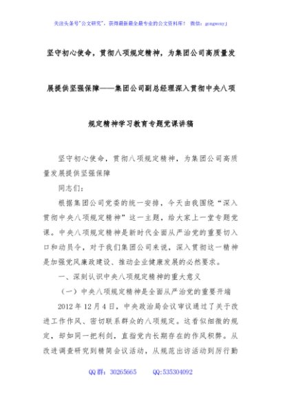 坚守初心使命,贯彻八项规定精神,为集团公司高质量发展提供坚强保障——集团公司副总经理深入贯彻中央八项规定精神学习教育专题党课讲稿