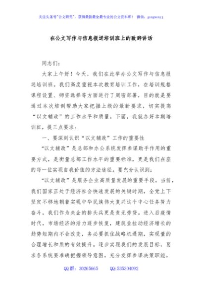/ 在公文写作与信息报送培训班上的致辞讲话