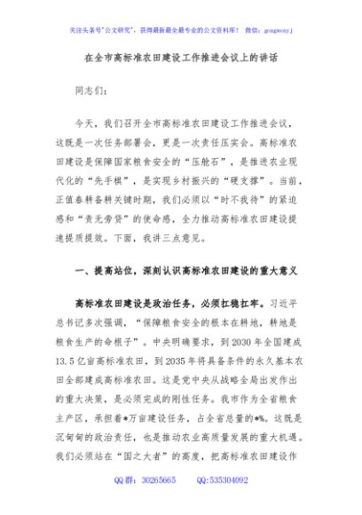/ 在全市高标准农田建设工作推进会议上的讲话