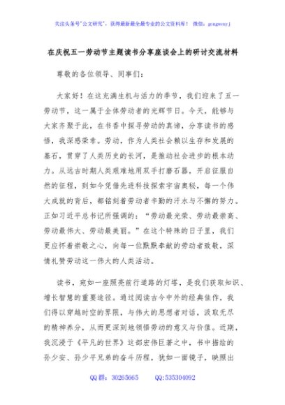 / 在庆祝五一劳动节主题读书分享座谈会上的研讨交流材料