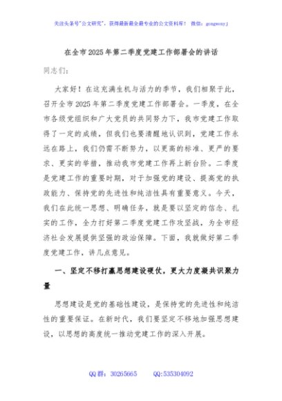 / 在全市2025年第二季度党建工作部署会的讲话