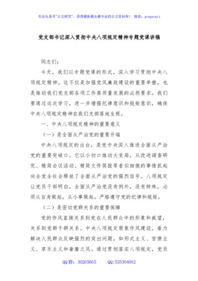 / 党支部书记深入贯彻中央八项规定精神专题党课讲稿