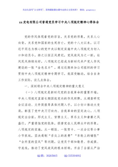 / xx发电有限公司普通党员学习中央八项规定精神心得体会