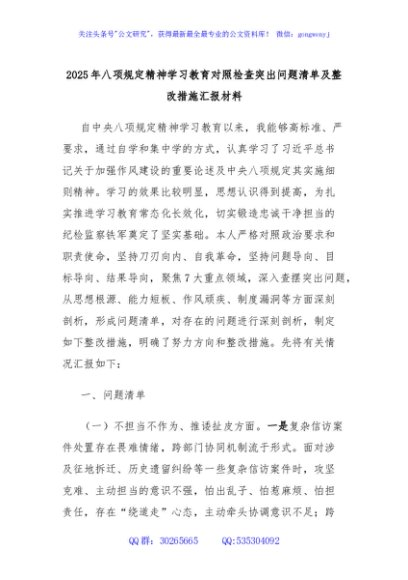 / 2025年八项规定精神学习教育对照检查突出问题清单及整改措施汇报材料