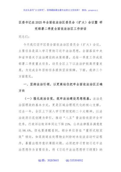 / 区委书记在2025年全面依法治区委员会(扩大)会议暨 研究部署二季度全面依法治区工作讲话