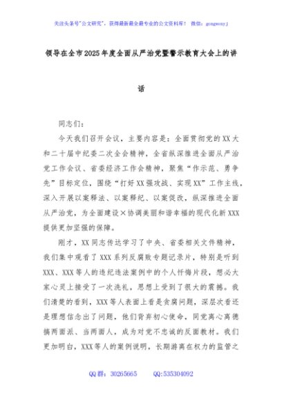 / 领导在全市2025年度全面从严治党暨警示教育大会上的讲话