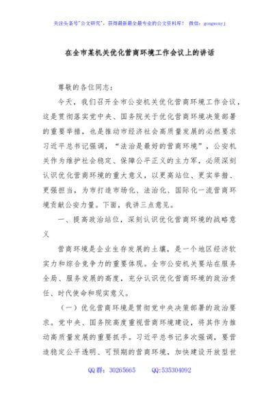 / 在全市某机关优化营商环境工作会议上的讲话
