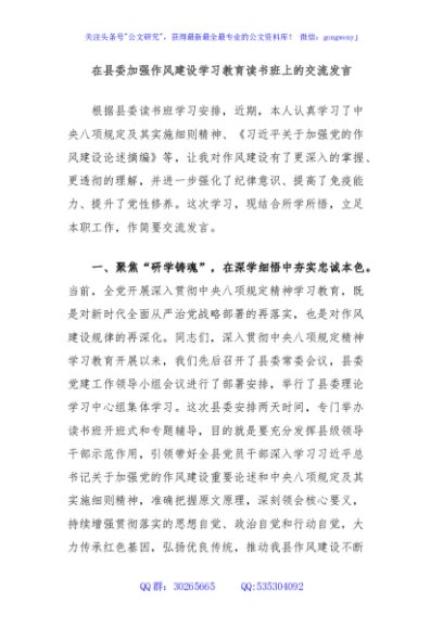 / 在县委加强作风建设学习教育读书班上的交流发言