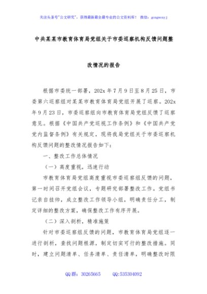 / 中共某某市教育体育局党组关于市委巡察机构反馈问题整改情况的报告