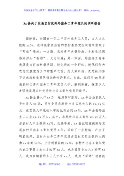 / Xx县关于发展农村优秀外出务工青年党员的调研报告