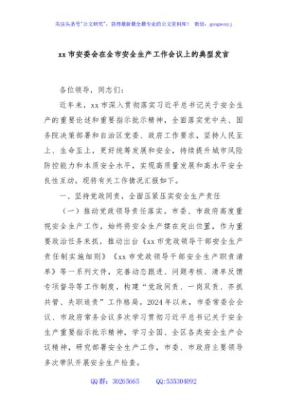 / xx市安委会在全市安全生产工作会议上的典型发言